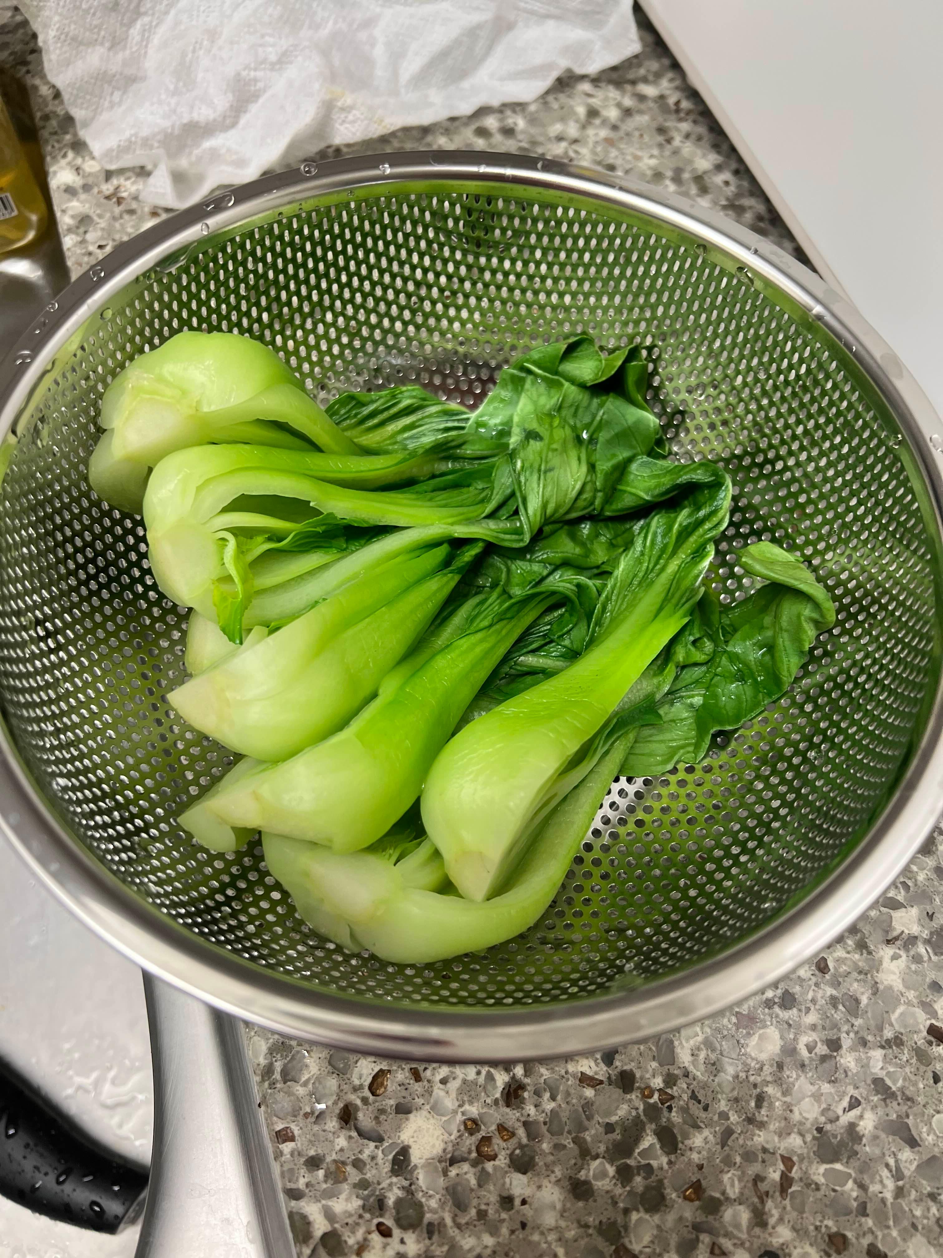 4. 청경채는 반으로 갈라 소금을 반스푼 넣은 물에 일분 정도 데쳐줍니다.